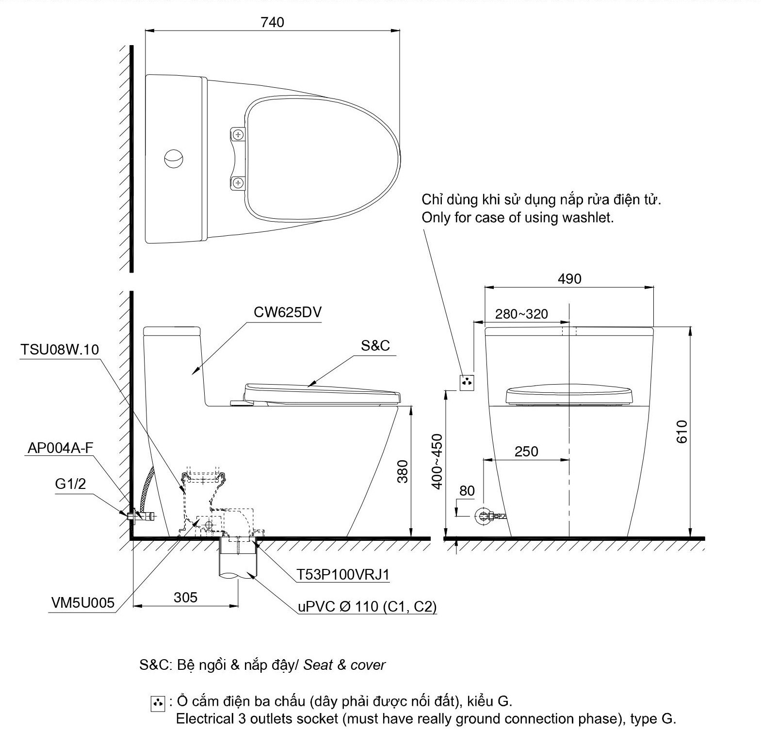 Bàn Cầu 1 Khối Kèm Nắp Rửa Điện Tử WASHLET S7 – MS625DW11